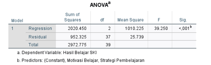 Hasil uji F dalam analisis regresi menunjukkan nilai F sebesar 39.250 dengan nilai signifikansi (Sig.) < 0.001. Karena nilai signifikansi jauh lebih kecil dari 0.05, maka dapat disimpulkan bahwa model regresi secara simultan signifikan. Artinya, secara bersama-sama variabel bebas yaitu strategi pembelajaran dan motivasi belajar memiliki pengaruh yang signifikan terhadap hasil belajar siswa pada mata pelajaran SKI di MI Al-Fajar Medan Deli.