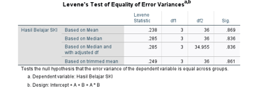 Sebelum dilakukan analisis varians (ANOVA), terlebih dahulu dilakukan uji homogenitas varians untuk memastikan bahwa data antar kelompok memiliki varians yang seragam. Uji ini diperlukan agar asumsi dalam analisis statistik parametrik terpenuhi. Dalam penelitian yang berjudul "Pengaruh Strategi Pembelajaran dan Motivasi Belajar terhadap Hasil Belajar SKI di MI Al-Fajar Medan Deli", uji homogenitas dilakukan menggunakan aplikasi SPSS versi 27 dengan bantuan uji Levene. Hasil dari uji ini akan menjadi dasar dalam menentukan kelayakan penggunaan analisis varians pada tahap berikutnya.