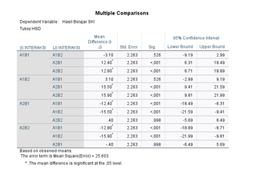 Setelah diketahui adanya perbedaan yang signifikan melalui analisis varians (ANOVA), maka dilakukan uji lanjutan berupa Uji Tukey untuk mengetahui secara lebih rinci kelompok-kelompok mana yang memiliki perbedaan signifikan. Uji ini penting untuk mengidentifikasi pasangan kelompok perlakuan yang menunjukkan pengaruh nyata terhadap hasil belajar. Uji Tukey dilakukan dengan menggunakan aplikasi SPSS versi 27 sebagai analisis post hoc guna mendukung interpretasi hasil penelitian secara lebih spesifik dan mendalam.