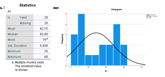 Berdasarkan output deskriptif statistik dari kelas yang menggunakan strategi pembelajaran Project Based Learning (PjBL), diperoleh jumlah siswa yang valid sebanyak 20 orang. Nilai rata-rata (mean) yang dicapai siswa adalah 82,15, yang menunjukkan bahwa secara umum hasil belajar siswa berada dalam kategori baik. Nilai median sebesar 82,00 menandakan bahwa setengah dari siswa memperoleh nilai di atas 82 dan setengahnya lagi di bawah nilai tersebut. Nilai modus sebesar 76 menunjukkan nilai yang paling sering muncul, meskipun catatan menunjukkan bahwa terdapat lebih dari satu modus dan angka 76 merupakan yang terkecil. Rentang nilai berkisar dari 76 hingga 90, dengan standar deviasi sebesar 5,050 yang mengindikasikan adanya variasi nilai antar siswa, meskipun tidak terlalu menyebar jauh dari rata-rata. Secara keseluruhan, data ini menunjukkan bahwa penerapan strategi PjBL memberikan hasil belajar yang cukup konsisten dan cenderung positif di kelas tersebut.