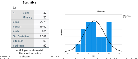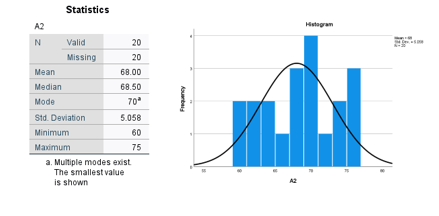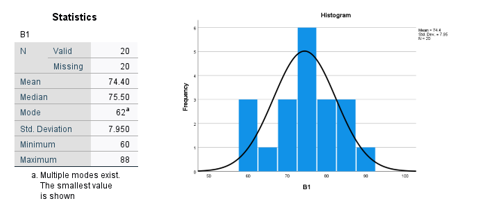 Standar deviasi sebesar 5,051 menunjukkan tingkat variasi atau sebaran nilai siswa dari rata-rata tergolong sedang. Nilai minimum yang diperoleh siswa adalah 60, sedangkan nilai maksimum adalah 75, yang menunjukkan adanya rentang nilai sebesar 15 poin. Histogram yang ditampilkan menunjukkan distribusi data yang relatif simetris dengan puncak pada rentang nilai sekitar 68-70, meskipun distribusi tidak sepenuhnya normal karena terdapat lebih dari satu puncak frekuensi.