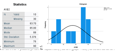 Berdasarkan hasil analisis deskriptif statistik pada kelompok siswa yang menggunakan strategi pembelajaran Project Based Learning (PjBL) dengan motivasi belajar rendah (A1B2), diketahui bahwa nilai rata-rata hasil belajar siswa berada pada angka 83,70, yang mengindikasikan pencapaian akademik yang cukup tinggi meskipun berada dalam kategori motivasi rendah. Nilai median sebesar 85,00 dan modus 88 menunjukkan bahwa sebagian besar siswa memiliki nilai pada rentang yang cukup tinggi. Jumlah siswa valid yang dianalisis sebanyak 10, sementara data yang tidak tersedia berjumlah 30. Simpangan baku sebesar 5,376 menunjukkan variasi nilai yang sedikit lebih tinggi dibandingkan kelompok motivasi tinggi, dan nilai berkisar antara 76 hingga 90, dengan rentang nilai sebesar 14 poin.