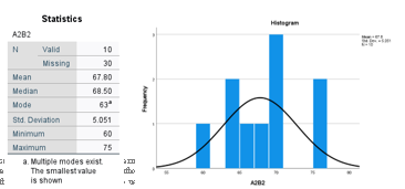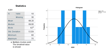 Berdasarkan hasil analisis deskriptif statistik terhadap kelompok siswa yang menggunakan strategi pembelajaran ekspositori dengan motivasi belajar tinggi (A2B1), diperoleh nilai rata-rata hasil belajar sebesar 68,20, dengan median 69,00 dan modus 62, yang merupakan nilai paling sering muncul dalam kelompok ini. Terdapat 10 data valid yang dianalisis, sementara 30 data lainnya hilang atau tidak tersedia. Simpangan baku (standard deviation) sebesar 5,329 menunjukkan adanya variasi yang cukup mencolok antar individu dalam pencapaian hasil belajar. Nilai minimum dalam kelompok ini adalah 60, sedangkan nilai maksimum adalah 75, sehingga rentang nilai berada pada angka 15 poin, yang cukup lebar untuk kelompok dengan jumlah data terbatas.