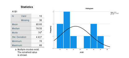 Berdasarkan hasil analisis deskriptif statistik terhadap kelompok siswa yang belajar menggunakan strategi pembelajaran Project Based Learning (PjBL) dengan motivasi belajar tinggi (A1B1), diperoleh rata-rata nilai sebesar 80,60 dengan simpangan baku 4,427. Nilai median sebesar 78,50 dan modus 76 menunjukkan bahwa distribusi nilai sedikit condong ke kanan (positif skewness), yang mengindikasikan bahwa sebagian besar siswa memperoleh nilai mendekati atau di bawah rata-rata. Rentang nilai berkisar antara 76 hingga 88, dengan jumlah data valid sebanyak 10 dan data yang hilang sebanyak 30. Penyebaran nilai ini menunjukkan bahwa capaian hasil belajar siswa dalam kelompok ini tergolong tinggi dan relatif merata, tanpa adanya perbedaan ekstrem antar individu.