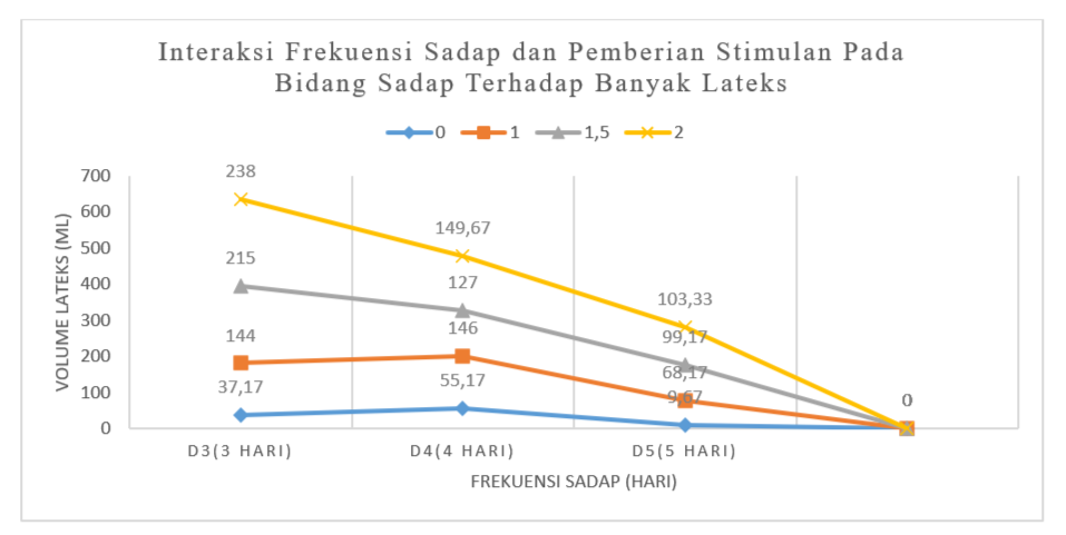 Berdasarkan hasil sidik ragam menunjukkan bahwa interaksi dari frekuensi sadap dan stimulan tidak berpengaruh signifikan terhadap volume lateks, berat basah lateks, berat kering lateks dan kadar karet kering.