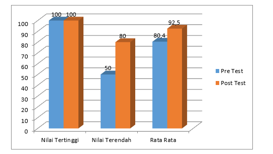 Berdasarkan gambar 2 didapatkan data nilai pretest dan post test. Nilai pre test berfungi guna memahami kemampuan murid sebelum diberikan treatment menggunakan metode SAS. Sedangkan post test berfungsi untuk mengetahu peningkatan hasil yang diperoleh murid setelah diberikan treatment. Dapat diketahui bahwa data nilai pretest yang dihasilkan terendah ada di angka 50 serta nilai tertinggi di angka 100. Sedangkan untuk postest yang berfungsi untuk mengetahui hasil yang diperoleh siswa setelah adanya perlakuan menggunakan metode SAS nilai terendahnya 80 dan nilai tertinggi adalah 100 sehingga diperoleh nilai rerata untuk pretest 80,4 dan nilai rerata post test 92,5.