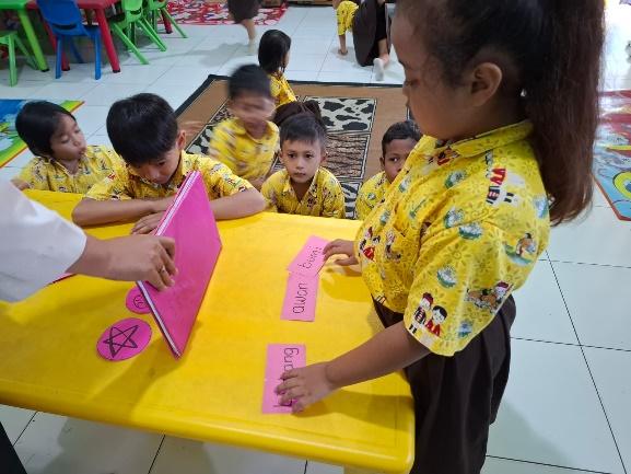 Kegiatan bermain kartu kata ini memberikan pengalaman mengenali simbol huruf, membedakan bunyi awal kata, serta melatih keberanian anak untuk tampil dan menjawab di depan teman-temannya. Glann Doman berpendapat bahwa kartu kata bergambar merupakan media yang efektif membantu anak untuk mengembangkan aspek kognitif dalam hal mengingat dan menghafal kata serta gambar, pendapat ini juga didukung oleh Ratnawati yang menyatakan bahwa kartu kata bergambar dapat merangsang kecerdasan, daya ingat, serta minat belajar pada anak [29]. Kartu kata dipilih menjadi salah satu kegiatan dalam program GALERIA karena melalui kartu kata bergambar ini selain karena fungsinya yang mendukung pertumbuhan dan perkembangan anak juga merupakan media pembelajaran yang menarik, karena anak dapat melihat kombinasi warna dan juga bentuk yang menarik terpampang dalam kartu tersebut