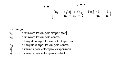 Setelah kedua uji prasyarat terpenuhi, dilakukan uji hipotesis untuk mengetahui ada atau tidaknya perbedaan signifikan antara kelompok eksperimen dan kelompok kontrol. Uji yang digunakan adalah uji t dengan polled varians karena kedua kelompok diasumsikan memiliki varians yang homogen. Rumus yang digunakan adalah: