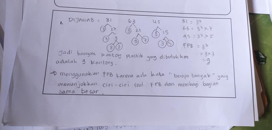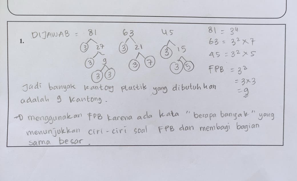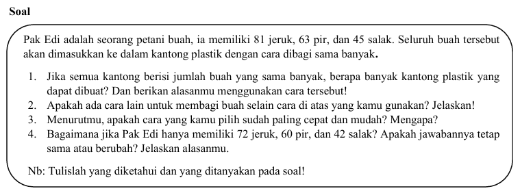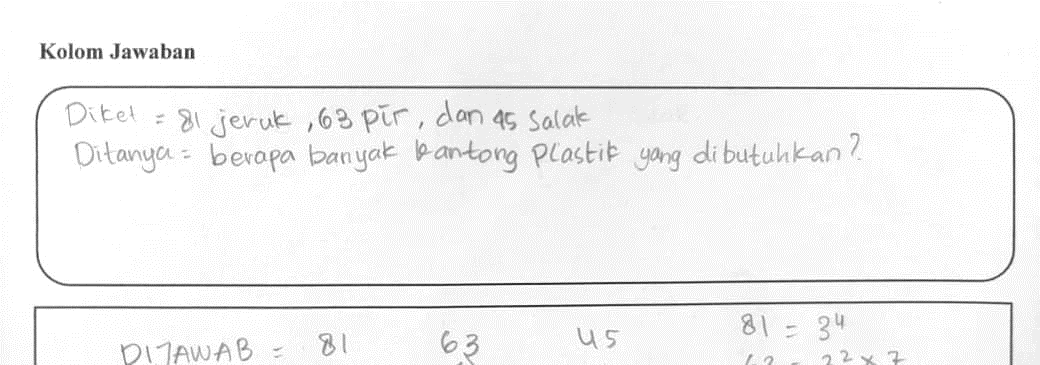 RV : Di soal itu diketahui kalo ada 81 jeruk, 63 pir, dan 45 salak, terus mau dibagikan sama banyak.