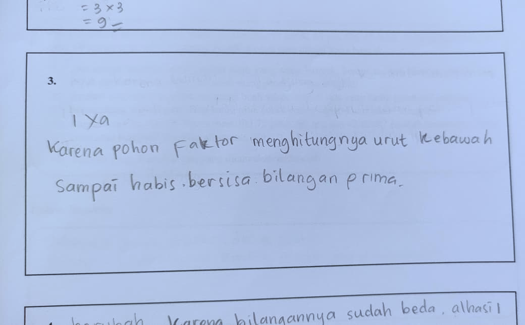 kebawah juga ketemu 9, tapi ya gitu lama ngerjain terus harus teliti karena kan angkanya berulang sampek kebawah terus sampek di samping harus sama-sama prima jadi ketemu deh hasilnya. Sebenere sama kayak pohon faktor tapi ini menyamping dan itu tadi bedanya angka e berulang kesamping walaupun kebawah juga sih ngitungnya .