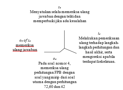 Ilustrasi di atas menunjukkan bagaimana aspek Self-Regulationmuncul. Melalui S4 = “Menyatakan selalu memeriksa ulang jawaban dengan teliti dan memperbaiki jika ada kesalahan”, hal ini menunjukkan bahwa dalam menyelesaikan masalah selalu hati-hati dan teliti., kemudian diketahui objek matematika tentang I4 Adalah memeriksa ulang perhitungan FPB dengan soal yang mirip dari soal utama dengan perhitungan 72,60 dan 42 tetapi hasil perhitungannya tidak sama. Ruang interpretant yang didapatkan adalah RV selalu melakukan Melakukan pemeriksaan ulang terhadap pengerjaan soalnya dan membuat tindakan jika terdapat keliruan. Berikut terlihat dari petikan wawancaranya.
