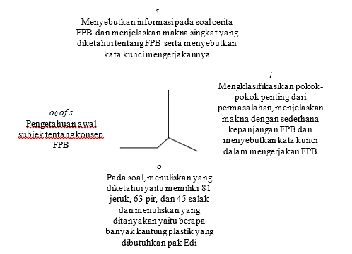Berdasarkan gambar diatas memperlihatkan aspek Interpretation, RV mampu mengklasifikasikan informasi pada soal serta mampu menjelaskan makna dengan bahasa sendiri dan menyebut kata kunci dalam pengerjaan soal. Melalui s = “Menyebutkan informasi pada soal cerita FPB dan menjelaskan makna singkat yang diketahui tentang FPB dan menyebutkan kata kunci mengerjakannya”, dapat dilihat bahwa RV telah memahami masalah yang ada dan mampu menjelaskan suatu makna kembali dengan bahasa sendiri. Kemudian diketahui pada objek matematika tentang i adalah “menuliskan yang diketahui yaitu memiliki 81 jeruk, 63 pir, dan 45 salak dan menuliskan yang ditanyakan yaitu berapa banyak kantong plastik yang dibutuhkan pak Edi”. Hal ini di dapatkan dari pengetahuan awal subjek tentang konsep materi FPB. Berikut hasil pengerjaan soal tes dan petikan wawancara dengan RV.