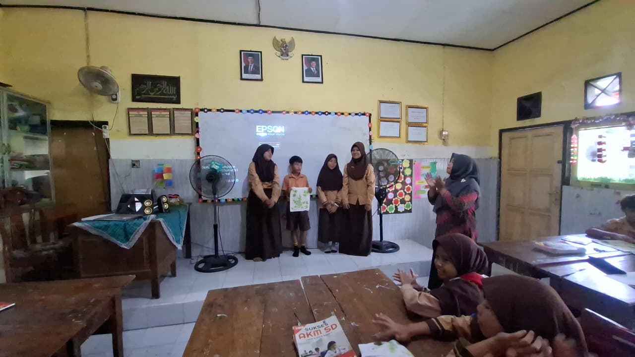 Observasi yang dilakukan selama proyek ecoprint memperlihatkan bagaimana suasana menyenangkan mendorong perilaku berbagi. Peserta didik terlihat antusias menukar bahan alami, saling membantu dalam proses pemukulan kain, hingga bersama-sama mengatur pola daun. Puncak dari kegiatan ini adalah ketika setiap kelompok diminta untuk menampilkan hasil karya di depan kelas. Berdasarkan Gambar 3, terlihat bagaimana peserta didik dengan penuh percaya diri mempresentasikan karya kelompoknya sambil disambut tepuk tangan teman-temannya. Situasi ini menunjukkan bahwa suasana belajar yang menyenangkan tidak hanya membangkitkan rasa bangga, tetapi juga memfasilitasi praktik berbagi ide, pengalaman, dan hasil kerja secara nyata. Kondisi ini sejalan dengan hasil studi tentang joyful learning[25], yang menjelaskan bahwa suasana kelas yang menyenangkan dan penuh kegembiraan membuat peserta didik merasa nyaman, tidak terbebani, dan lebih aktif dalam proses belajar.