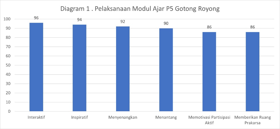 Hasil tersebut semakin diperkuat dengan temuan yang ditunjukkan pada Diagram 1, yaitu efektivitas pelaksanaan modul ajar dalam proyek Penguatan Profil Pelajar Pancasila (P5) tema gotong royong. Setiap indikator dinilai dengan skala 1–5 yang dikonversi ke skala 100%. Indikator “interaktif” memperoleh skor tertinggi (96%), yang menunjukkan bahwa strategi pembelajaran guru telah berhasil mendorong komunikasi dan kerja sama peserta didik secara efektif. Indikator lain seperti “inspiratif” (94%), “menyenangkan” (92%), dan “menantang” (90%) juga menunjukkan capaian yang tinggi. Hal ini selaras dengan praktik di kelas ketika guru merancang proyek yang menarik, misalnya ecoprint, yang memungkinkan peserta didik berkolaborasi, saling berbagi, sekaligus menumbuhkan kepedulian terhadap teman sebaya. Suasana belajar yang positif dan menyenangkan terbukti mendorong antusiasme serta keterlibatan emosional peserta didik dalam kegiatan belajar.
