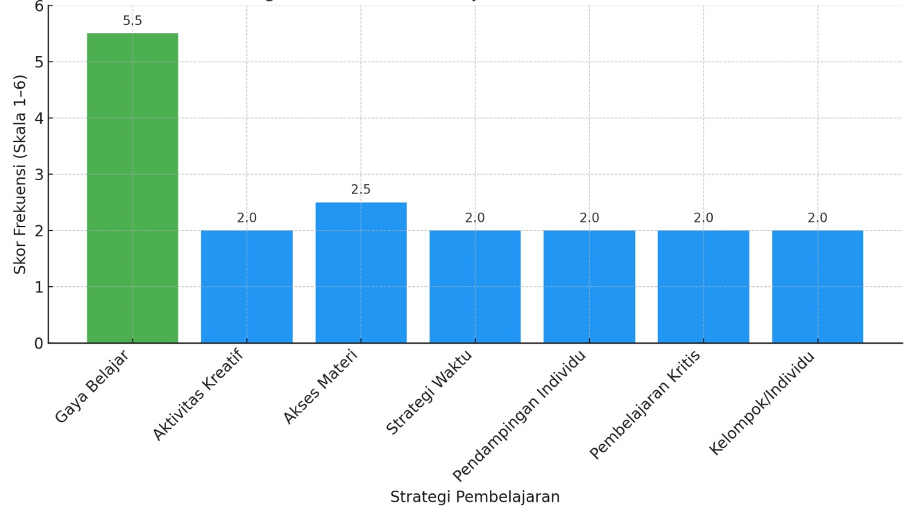 Strategi yang lain aktivitas kreatif, akses materi beragam dan pendampingan individu, menunjukkan frekuensi yang setara yakni berada di antara skor 2 sampai 2,5 yang melihatkan jika hal ini masih perlu ditingkatkan. Sedangkan pemberian opsi akses materi berada di skor 2,5 juga masih terlihat rendah maka perlu diberikan penguatan dalam menyediakan media belajar yang lebih bervariasi.
