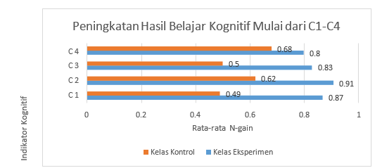 Berdasarkan hasil perhitungan pada Gambar 1 aspek kognitif C1 (mengingat) pada kelas kontrol memperoleh skor 0,49 yang termasuk dalam kategori sedang. Sedangkan pada kelas eksperimen memperoleh skor 0,87 dengan kategori tinggi. Hal ini mengindikasikan bahwa guru telah mempresentasikan materi dengan jelas sehingga siswa paham dan mengingat materi yang telah diajarkan. Aspek kognitif C2 (memahami) pada kelas control memperoleh skor 0,62 yang termasuk dalam kategori sedang. Sedangkan pada kelas eksperimen memperoleh skor 0,91 yang termasuk dalam kategori tinggi. Aspek kognitif C3 (menerapkan) pada kelas kontrol memperoleh skor 0,5 yang termasuk dalam kategori sedang. Sedangkan pada kelas eksperimen memperoleh skor 0,83 yang termasuk dalam kategori tinggi. Aspek kognitif C4 (menganalisis) pada kelas kontrol memperoleh skor 0,68 yang termasuk dalam kategori sedang, sedangkan pada kelas eksperimen memperoleh skor 0,8 yang termasuk dalam kategori tinggi. Sesuai dengan hasil yang didapatkan, aspek kognitif C1-C4 kelas kontrol mendapat kategori sedang dan pada kelas eksperimen mendapat kategori tinggi, hal ini dikarenakan materi struktur bumi dan perkembangannya yang menggunakan model pembelajaran kooperatif tipe TGT berbantuan media blindbox pada aspek kognitif C1-C4 dapat memberikan pemahaman materi pada siswa dengan baik dan dapat memberikan dampak baik pula pada hasil belajar IPA siswa. Siswa terlibat aktif dalam kegiatan pembelajaran, memjawab pertanyaan dan berdiskusi. Sehingga hasil belajar IPA yang diperoleh lebih tinggi dibandingkan kelas kontrol. Pada kelas kontrol yang menggunakan model pembelajaran langsung, siswa kurang terlibat aktif dalam proses pembelajaran.