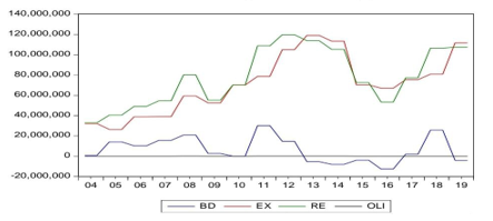Table 5 illustrates the ratio relationship among the variables examined utilizing the Granger method, as a substantial correlation exists between (EX-RE), specifically between overhead and general income [22], [23]. There is also a strong interdependency between (BD-RE), general income, and general balance, and between (RE), general revenue, and oil prices. Moreover, there is a direct relationship between (BD) and (EX), and a significant relationship that also exists between oil prices and (BD) deficit or surplus. This accords with the economic rationale that prices of oil shape rentier dynamics in the economies [24].