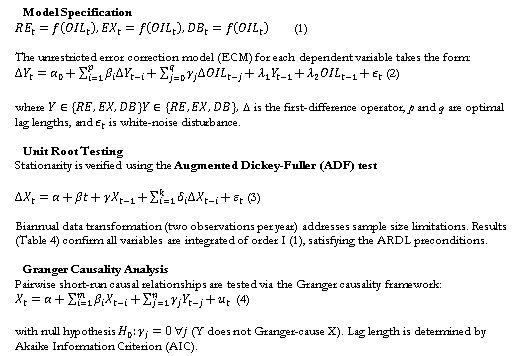 The ARDL Bounds Test approach by Pesaran and al. (2001) by investigating the dynamic relation between crude oil prices (OIL) and fiscal variables of Iraq [public revenues (RE), public expenditure (EX), and budget deficit (DB)] over the period 2004–2020.The ARDL framework is selected for its robustness in modeling cointegration with variables of mixed integration orders [I (0) or I (1)], superior small-sample performance, and simultaneous estimation of short-run dynamics and long-run equilibrium. The methodology follows a five-stage analytical procedure.