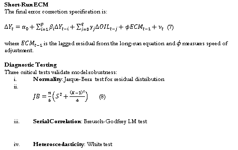 This study empirically establishes that Iraq’s general budget (2004–2020) exhibits extreme vulnerability to oil price volatility, with Granger causality tests confirming unidirectional oil price shocks drive public revenues (RE) and expenditures (EX), while revealing a destabilizing bidirectional feedback loop between expenditures and budget deficits (DB). Univariate and multivariate unit root tests revealed I (1) integration of all the variables so that ARDL bounds testing was justified, additionally it also validated that there were strong long-run cointegrating relationships (F-statistic=11.47>1% critical bound). On the long run elasticities It is demonstrated that there appears rentier susceptibility in Iraq with the fragility (1% = 1.01%) of the oil price leading to a higher rise in expenditure (Table 10) and a marginal decrease in deficit (−0.44%) which means a pro-cyclical spending behaviour. Short-run characteristics (Table 9) further reveal acute sensitivity: expenditures respond rapidly (elasticity: 0.95) to price upturns, whereas deficits deepen sharply (elasticity −0.44) to downturns underpinned by unusually rapid error correction rate (CointEq(−1): −1.14, p = 0.000), implying 114% per annum adjustment towards equilibrium which emphasizes ingrained fiscal instability. Oil prices export revenues 99.8% (Adj.R2) of the variabi- lity. R², Table 6), and model validation diagnostic tests revealed stable model (normality p = 0.84; no autocorrelation p = 0.71; homoscedasticity p = 0.48). These results throw into sharp relief Iraq’s existential fiscal predicament: absent swift diversification away from the 99% oil-dependent revenue architecture, binding fiscal strictures to halt procyclical spending proclivities, and sovereign debt instruments to manage deficits, dramatic budget disruption as hallmarks of volatile global oil market gyrations will continue its ongoing reenactment. However, this analysis acknowledges the methodological limitations of six-month averaging to reveal more frequent volatility and the fact that exogenous shocks such as the Da’esh conflict and political instability (Jiyad, 2018) are not modelled as structural breakpoints. The future efforts will need to be carried out on quarterly basis and include explicit dummy variables for social-political crises, non-oil in GDP (Gross Domestic Product) growth rates, corruption indices, and geopolitical risks within the DSGE (Dynamic Stochastic General Equilibrium) models to “easily” offer policy recommendations.