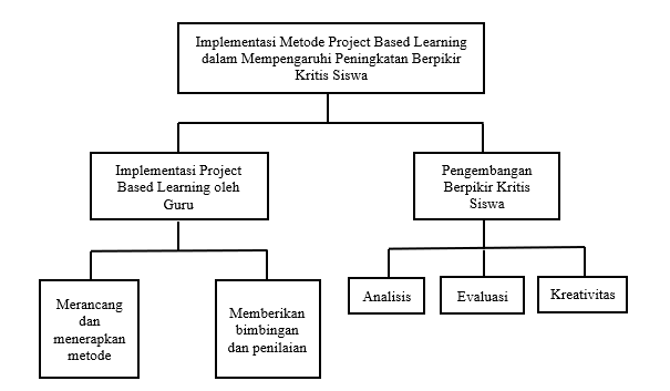 Pembelajaran basis Project Based Learning ini berpusat pada peserta didik yang berpacu pada pembuatan proyek, pemantauan kemajuan hasil proyek, serta evaluasi setelah pembuatan proyek, sehingga metode ini dapat memberikan peluang yang tinggi sebagai penunjang pembelajaran agar lebih berkesan dan bermakna kreatif.[7] Model pembelajaran basis Proyek ini juga memfasilitasi peserta didik untuk dapat berkarya secara pribadi maupun berkelompok. Akan tetapi, keberhasilan dari metode ini tergantung dari beberapa faktor yang mempengaruhi, baik itu dari peserta didik maupun dari pendidik. Faktor keberhasilan dari faktor pendidik ini dapat dilihat dari bagaimana seorang pendidik mampu merancang proses pembelajaran dengan cara yang lebih menarik dan memberikan kesenangan bagi para peserta didik. Namun, disisi lain terkadang pendidik hanya menyampaikan pengetahuan tanpa menyediakan peluang bagi siswa untuk mengasah kemampuan masing-masing. Sehingga dalam proses belajar, penting untuk memfokuskan pada partisipasi aktif dari setiap peserta didik.[8] Maka dari itu, agar kemampuan berpikir kritis siswa dapat berkembang, dibutuhkan adanya pendampingan pada proses pembelajaran yang berbeda dari sebelumnya, dari yang semula terlihat monoton menjadi lebih berkreatif. Adapun implementasi dari metode PBL dalam mendorong skill berpikir kritis murid antara lain seperti pada kerangka konseptual di bawah ini: