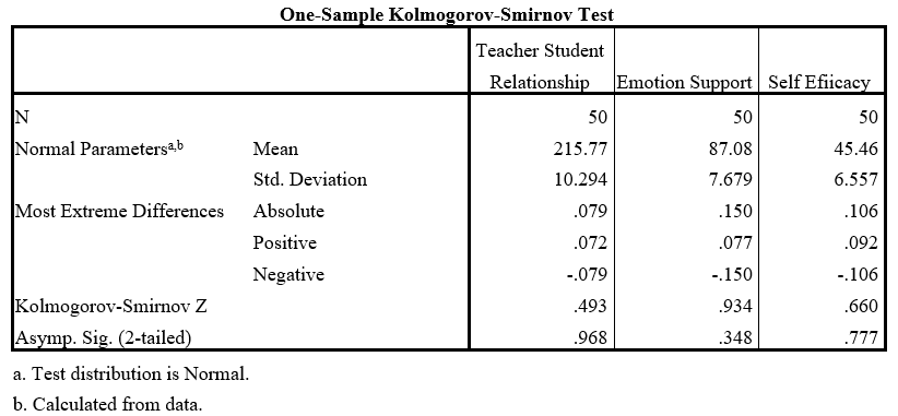 Berdasarkan dari data Uji Normalitas Kolmogorof-smirnov di atas dapat diketahui nilai signifikansi Relasi Guru Siswa (TSR) yaitu 0,968 berarti nilai tersebut lebih dari 0,05 (0,968 > 0,05) dan dapat dikatakan bahwa data distribusi tersebut normal. signifikansi Dukungan Emosi (ES) yaitu 0,348 berarti nilai tersebut lebih dari 0,05 (0,348 > 0,05) dan dapat dikatakan bahwa data distribusi tersebut normal. signifikansi SE yaitu 0,777 berarti nilai tersebut lebih dari 0,05 (0,777 > 0,05) dan dapat dikatakan bahwa data distribusi tersebut normal.