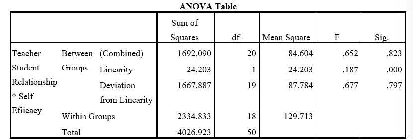 Dalam Uji Linieritas diatas diketahui bahwa nilai signifikansi linearity Relasi Guru Siswa (TSR) dan Efikasi Diri (SE) adalah 0,000 yang dapat diartikan nilai linearity lebih kecil daripada 0,05 (0,005 < 0,05) dan nilai signifikansi deviation from linearity sebesar 0,797 yang dapat diartikan bahwa nilai deviation from linearity lebih besar dari 0,05 (0,797 > 0,05). Maka dapat disimpulkan bahwa kedua data tersebut linier.