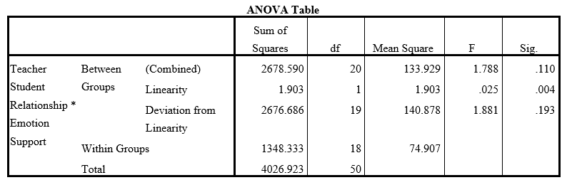 Hasil uji linieritas diatas diketahui bahwa nilai signifikansi linearity Teacher Student Relationship (TSR) dan Dukungan Emosi (ES) adalah 0,004 yang dapat diartikan nilai linearity lebih kecil daripada 0,05 (0,005 < 0,05) dan nilai signifikansi deviation from linearity sebesar 0,193 yang dapat diartikan bahwa nilai deviation from linearity lebih besar dari 0,05 (0,063 > 0,05). Maka dapat disimpulkan bahwa kedua data tersebut linier.