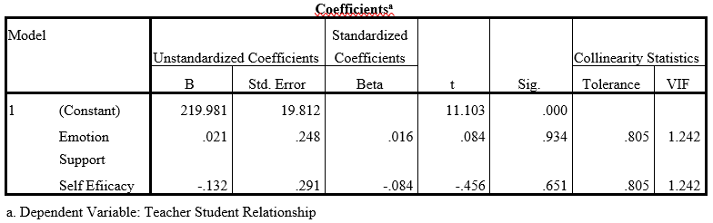 Setelah melihat hasil riset yang sudah selesai, bisa disimpulkan bahwa relasi antara pengajar dan pelajar sangat dipengaruhi oleh efikasi diri pengajar dan dukungan emosional, meskipun pengaruh dari dua hal ini hanya sekitar 12%. Hal ini menandakan bahwa hal-hal dari dalam diri seperti keyakinan pengajar pada kemampuan dirinya dan memberi bantuan perasaan punya peran penting dalam membuat hubungan baik dengan pelajar, tetapi tidak bisa menjelaskan semua hal tentang hubungan pengajar-pelajar. Angka penting sebesar 0.049 (p < 0.05) memastikan bahwa secara bersamaan cara yang diuji sudah tepat, tetapi ukuran dampak yang agak kecil memberi petunjuk bahwa ada hal lain yang lebih memengaruhi hubungan tersebut, seperti kemampuan berbicara dengan orang lain, rasa ikut merasakan, cara mengajar, serta hal dari luar seperti aturan sekolah dan latar belakang pelajar. Karena itu, meskipun meningkatkan rasa percaya diri dan dukungan perasaan pengajar itu penting, usaha meningkatkan baiknya hubungan pengajar-pelajar sebaiknya juga melihat hal-hal lain, termasuk mengembangkan kemampuan sosial-perasaan pengajar dan perbaikan sistem bantuan sekolah. Selain itu, riset lebih lanjut dengan cara yang lebih rumit seperti metode gabungan atau jangka panjang diperlukan untuk memahami lebih dalam dan sesuai keadaan tentang hubungan pengajar-pelajar. Hasil riset ini bisa jadi dasar untuk membuat program bantuan berdasarkan pelatihan pengajar, yang tidak hanya fokus pada rasa percaya diri dan dukungan perasaan, tetapi juga pada cara belajar yang mudah diubah, pengaturan kelas yang menerima semua, dan bimbingan yang terus-menerus, sehingga tercipta suasana belajar yang mendukung dan hubungan pengajar-pelajar yang lebih baik serta bermakna