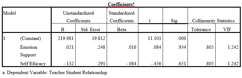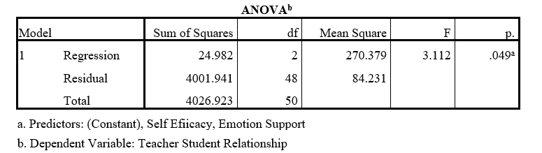 Hasil analisis regresi menunjukkan bahwa secara simultan efikasi diri (self-efficacy) dan dukungan emosi (emotional support) berpengaruh secara signifikan terhadap relasi guru-siswa (teacher-student relationship) dengan nilai signifikansi sebesar 0.049 (p < 0.05). Nilai ini menunjukkan bahwa model regresi cukup kuat untuk menjelaskan hubungan antara ketiga variabel tersebut dalam konteks sampel penelitian.