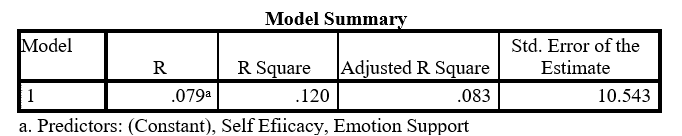 Dalam analisis diatas dapat diketahui bahwa f hitung = 3.210 (p = 0.049<0.05) nilai tersebut mengindikasikan bahwa hipotesis diterima. Hal ini berarti bahwa secara simultan (bersama-sama) variabel Dukungan Emosi (ES) dan Efikasi Diri (SE) memiliki pengaruh yang signifikan terhadap Relasi Guru Siswa (TSR). Adapun besar pengaruh kedua variabel yaitu dukungan emosi dan efikasi diri mampu memprediksi 12% terhadap relasi guru siswa.