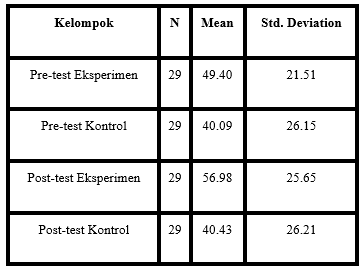 Tabel deskriptif di atas,menyajikan jumlah sampel (N), nilai rata-rata (Mean), dan standar deviasi (Std. Deviation) dari hasil pre-test dan post-test pada kelompok eksperimen dan kontrol. Kelompok eksperimen menunjukkan peningkatan rata-rata dari 49.40 pada pre-test menjadi 56.98 pada post-test, sementara kelompok kontrol mengalami sedikit peningkatan dari 40.09 menjadi 40.43. Standar deviasi yang cukup besar di kedua kelompok menunjukkan adanya variasi nilai antar peserta. Secara keseluruhan, tabel ini menggambarkan bahwa terdapat peningkatan hasil belajar yang lebih besar pada kelompok eksperimen setelah perlakuan dibandingkan dengan kelompok kontrol. Setelah data berdistribusi normal, maka peneliti melanjutkan dengan uji sampel t independen ntuk mengetahui seberapa jauh perbedaan rata-rata hasil belajar siswa [8].