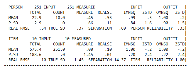 Summary statistics pada rasch model menunjukkan hasil pengujian kualitas instrumen secara keseluruhan dan interaksi siswa dengan instrumen penelitian yang digunakan [16].