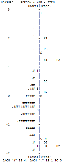 Gambar 2 menunjukkan Wright map dengan distribusi person (bagian kiri peta) yang cenderung berada di bagian bawah. Ini menggambarkan bahwa secara garis besar, para siswa memiliki kemampuan lebih rendah daripada tingkat kesulitan aitem. Hal ini dipertegas oleh gambar 3 yang menunjukkan nilai rata-rata logit siswa = -45 yang mana lebih rendah daripada nilai logit aitem = 0,0. Selain itu, dari Wright map dapat diketahui bahwa mayoritas siswa cenderung bersikap sebagai defender.