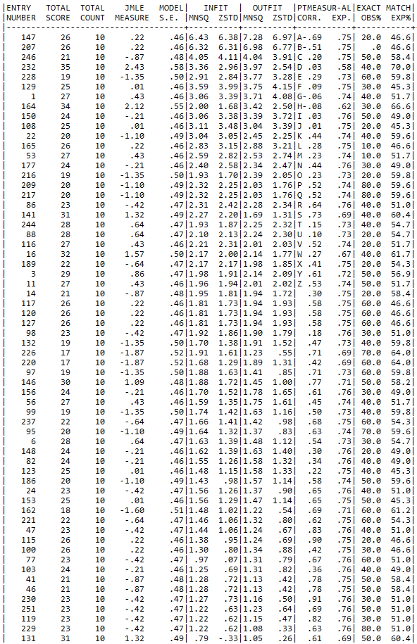 Person measure order berguna untuk mengetahui tingkat kemampuan siswa. Nilai pada JMLE measure menunjukkan nilai logit setiap siswa, yang mana semakin tinggi nilai yang didapatkan, maka semakin tinggi pula kemampuan yang dimiliki siswa [24].