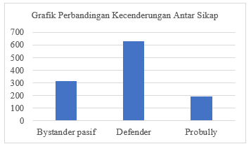 Tabel 5 menunjukkan ranks dari dari masing-masing sikap bystander pasif, defender, dan probully siswa. Berdasarkan hal ini, defender adalah sikap tertinggi dengan mean rank = 625,77 yang berarti sikap ini lebih cenderung dipilih oleh mayoritas siswa ketika mereka menyaksikan perundungan. Sebagai ilustrasi, gambar 6 menunjukkan grafik perbandingan antara ketiga sikap tersebut. Berdasarkan tabel 5 dan grafik pada gambar 6, tampak bahwa sikap bystander pasif dan probully kurang diminati oleh mayoritas siswa.