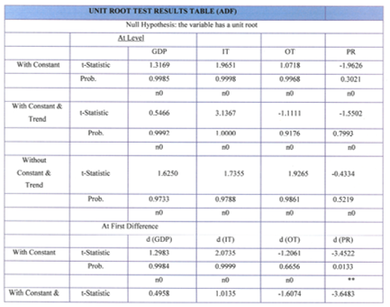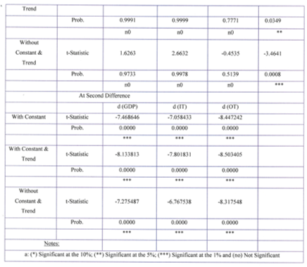 Second requirement: estimate model: at the beginning it will ensure that the stability of the time series to see if it contains the root of the unit (UNIT ROOT) Or not, through the test of Dickie Fuller developer (ADF), It has been shown through the table (4) that all-time series did not settle at their level, and stabilized public revenue chain (PR) At the first difference, while the GDP, tar revenue and income tax brackets stabilized at the second difference (Table 4).