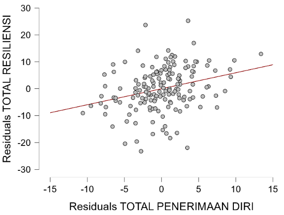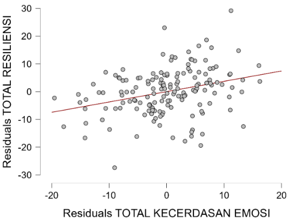Analisis yang tercantum dalam tabel 5 mengungkapkan bahwa kecerdasan emosional (X1) berperan secara signifikan dan memberikan pengaruh positif terhadap tingkat dengan koefisiensi B = 0.372, t sebesar 4.187, dan nilai p di bawah 0.001. Penerimaan diri (X2) juga menunjukkan pengaruh positif dan signifikan (B = 0.595; t = 3.801; p < 0.001). Nilai beta standar menunjukkan kontribusi kecerdasan emosional (β = 0.368) sedikit lebih besar dibandingkan penerimaan diri (β = 0.334). dengan demikian kedua variabel independent secara parsial berkontibusi signifikan dalam memprediksi resiliensi.