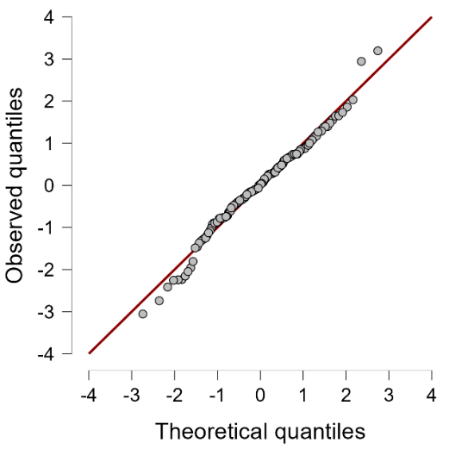 Pada grafik Q-Q plots uji asumsi normalitas diketahui bahwa data berdistribusi normal atau tidak. Berdasarkan gambar grafik di atas menunjukkan. Sebagaian besar nilai residual berada dekat dengan sumbu garis merah sehingga dapat disimpulkan bahwa data berdistribusi normal. Meskipun terdapat sedikit penyimpanan pada ujung grafik, hal tersebut tidak signifikan dan asumsi normalitas tepat terpenuhi.