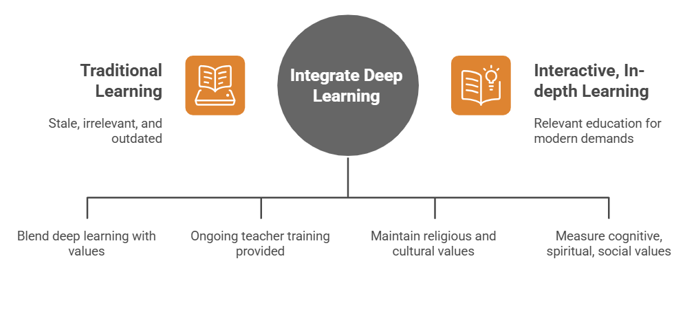 This image highlights the contrast between traditional learning approaches and modern deep learning in education. Traditional learning is depicted as outdated and irrelevant, while deep learning is portrayed as a more interactive and relevant method that aligns with the demands of modern education. The image emphasizes the importance of integrating deep learning with religious values, offering continuous teacher training, maintaining cultural values, and measuring not only cognitive growth but also spiritual and social development. This integration ensures that the learning process remains holistic and adaptive to the needs of today's students. With the right approach, pesantren can serve as an example of education that blends tradition with technological innovation, shaping future generations who are prepared to face global challenges while remaining committed to Islamic principles.