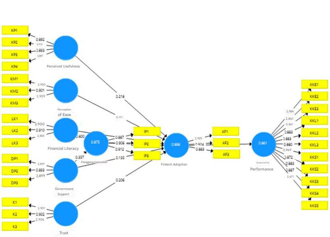 Based on the figure 3, the research model shows that Fintech Adoption functions as a mediating variable linking the determinants to Sustainability Performance. On the left side of the model, there are six exogenous constructs: Perceived Usefulness, Perceived Convenience, Financial Literacy, User Innovation, Government Support, and Trust. Each construct is measured by several indicators with high loading values, thus, it can be said that these indicators are able to represent the construct well.