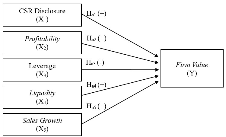 Berdasarkan hasil penelitian sebelumnya, CSR disclosure terbukti berpengaruh positif terhadap firm value karena pengungkapan CSR dipandang investor sebagai sinyal komitmen perusahaan terhadap keberlanjutan [9]. Ha1: CSR disclosure berpengaruh positif dan signifikan terhadap firm value. Profitability dilaporkan memberikan pengaruh positif terhadap firm value karena laba yang tinggi mencerminkan prospek usaha yang baik dan menarik minat investor [25]. Ha2: Profitability berpengaruh positif dan signifikan terhadap firm value. Berdasarkan penelitian, leverage ditemukan berpengaruh negatif terhadap firm value karena tingkat utang yang tinggi meningkatkan risiko keuangan dan menurunkan minat investor untuk melakukan investasi [7]. Ha3: Leverage berpengaruh negatif dan signifikan terhadap firm value. Liquidity diketahui berdampak positif terhadap firm value karena kemampuan perusahaan memenuhi kewajiban jangka pendek akan memperkuat kepercayaan pasar [28]. Ha4: Liquidity berpengaruh positif dan signifikan terhadap firm value. Sales growth ditemukan berpengaruh positif karena pertumbuhan penjualan mencerminkan keberhasilan strategi pemasaran dan potensi peningkatan laba [27]. Ha5: Sales growth berpengaruh positif dan signifikan terhadap firm value.