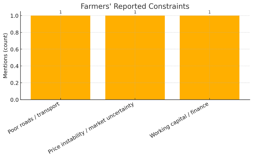 Farmers note three binding constraints: poor farm to market roads, unstable output prices, and limited working capital. Requested support clusters around road improvement, market access, and input/credit facilitation (farmers’ survey). The collector likewise cites road/transport as the main bottleneck and calls for basic coffee literacy among prospective growers (collector survey).