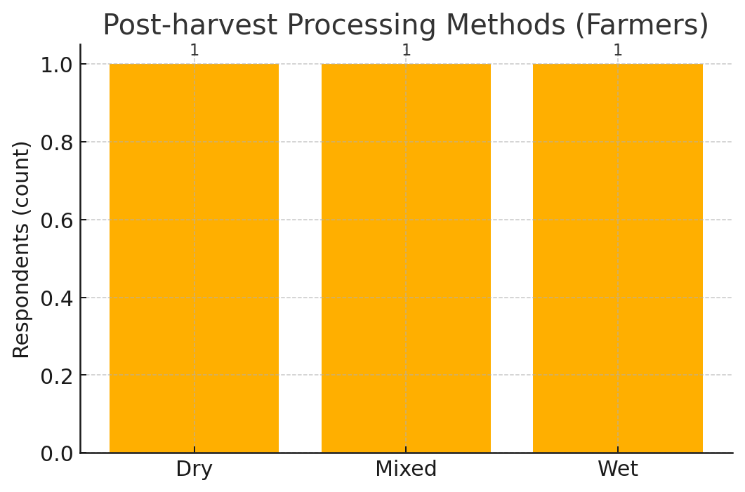 During fieldwork, the researcher procured a total of 20 kg of beans for pilot testing, consisting of 15 kg of wet beans ( 5 kg from each of the three farmers) and an additional 5 kg split between 4 day “natural” and “honey” micro lots. These lots were collected to (i) ground truth the process map with real materials, (ii) observe practical implications of short cycle drying under local conditions, and (iii) prepare small, labeled batches for preliminary market feedback. No cup scores or moisture measurements were recorded at this stage; accordingly, these pilot lots are treated as proof of concept material and do not alter the descriptive statistics above. Where relevant, they inform the discussion on product and functional upgrading (Section 4.2). Consistent with sector guidance, subsequent handling of such micro lots should target 12–13% moisture and basic defect control before any comparative price testing [3] [17].