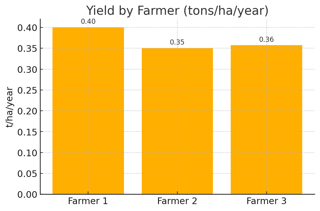 Yields (small sample) range from 0.70–0.80 t/ha/year of parchment/green equivalent, with mean 0.74 t/ha/year. Farmers practice mixed post harvest methods (one each: wet, dry, mixed), implying heterogeneity in moisture and defect control. Reported production costs imply costs of Rp10,114/kg on average and farmgate prices of Rp68,333/kg, yielding an average farm value added of Rp58,219/kg per semester cycle (farmer survey).