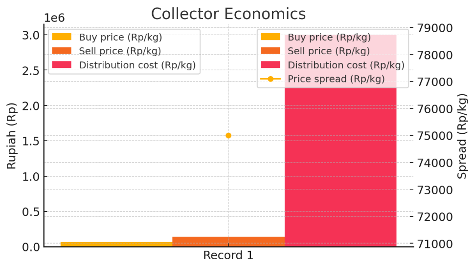Comparing the average farm price (Rp68,333/kg) to the collector’s sales price (Rp140,000/kg) yields a nominal spread of Rp71,667/kg with 51.2% of the downstream selling price. The collector’s net marketing margin (after reported distribution cost) is Rp72,500/kg, roughly 1.25× the average farm value added (Rp58,219/kg) in this sample. While based on a single collector observation, the pattern signals that much of the monetary value is captured beyond the farm gate (farmer and collector surveys).
