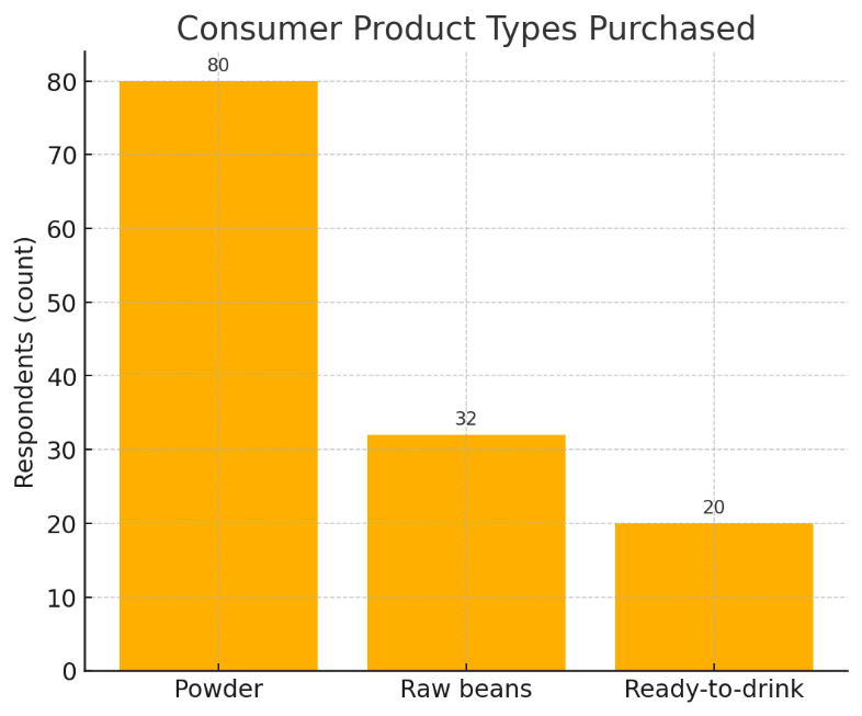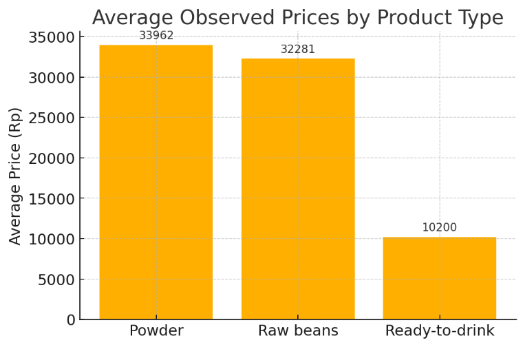 On the demand side, 60.6% of consumers buy powder, 24.2% raw beans, and 15.2% ready to drink beverages. Consumption frequency skews toward daily (30.3%) and weekly (29.5%) use; monthly and occasional segments account for 18.2% and 22.0%, respectively. Across the sample, the leading purchase driver is taste (“rasa”, 55.3%), followed by price (22.7%), origin (10.6%), packaging (7.6%), and recommendations (3.8%) (consumer survey). Typical observed prices for powder cluster around Rp32–35 thousand (mean Rp33,482, SD Rp4,264), while raw bean prices average Rp32,281; prices for ready to drink cups were not consistently recorded (consumer survey). Average reported quantities are 3.34 kg/month among kg buyers and 6.6 cups/month among cup buyers, aggregating to 374 kg/month across kg buyers in the sample.