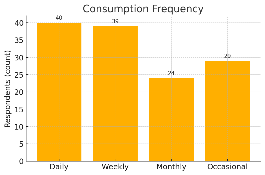 Overall, 60.6% of consumers state willingness to pay a premium; readiness is highest among ready to drink buyers (70.0%), weekly consumers (71.8%), and those influenced by recommendations (80.0%) or origin (64.3%). Willingness is weakest among respondents who prioritize packaging per se (30.0%). These patterns point to distinct opportunity spaces: flavor led segments for roasted/ground lines and experience led segments for cafés/beverage service (consumer survey).