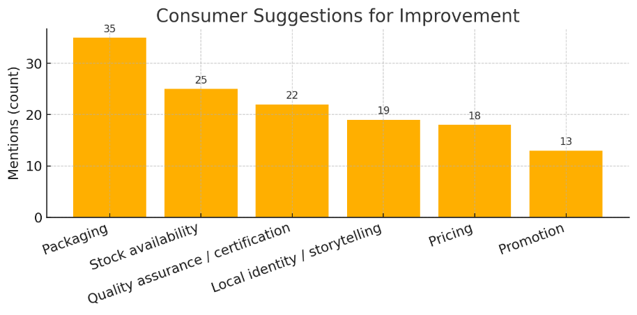 Customer side suggestions concentrate on packaging (n = 35), product availability/stock (n = 25), quality assurance/certification (n = 22), pricing (n = 18), promotion (n = 13), and emphasis on local identity (n = 13) (consumer survey).