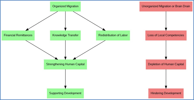 Migration is linked to the development of human capital through divergent pathways, as it can both positively contribute to its reshaping and negatively weaken it, as shown in Figure (2).