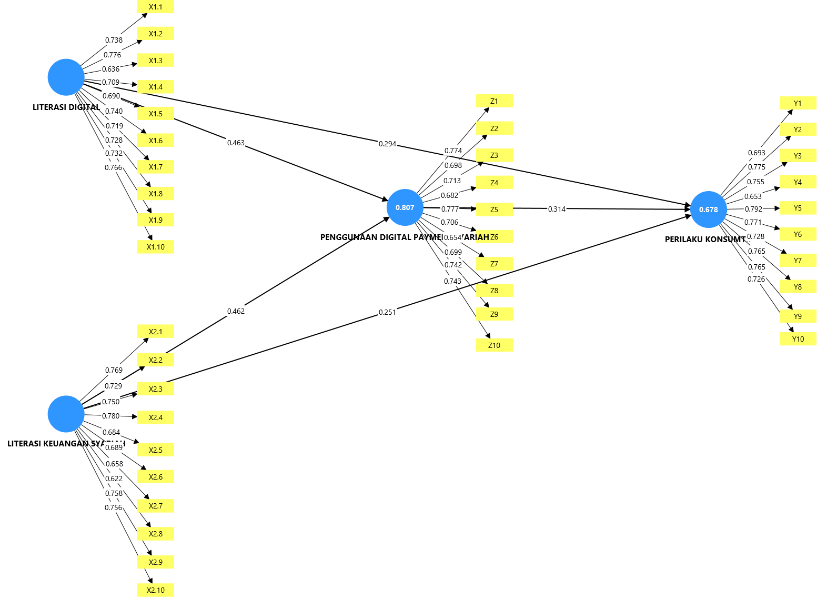 Based on the analysis and discussion, the conclusion of this study is that digital literacy has a significant direct effect on the use of sharia digital payments, as indicated by a T-Statistics value (8.961) > 1.96 and P-Values (0.000) < 0.05. Digital literacy has a direct and significant effect on consumptive behavior, as indicated by a T-Statistics value (3.583) > 1.96 and a P-Value (0.000) < 0.05. Sharia financial literacy has a significant direct effect on the use of Sharia digital payments, as indicated by a T-Statistics value (8.957) > 1.96 and P-Values (0.000) < 0.05. Sharia financial literacy has a significant direct effect on consumptive behavior, as indicated by a T-Statistics value (3.897) > 1.96 and P-Values (0.000) < 0.05. The use of Sharia digital payments directly influences consumptive behavior, as indicated by a T-Statistic value (3.900) > 1.96 and P-Values (0.000) < 0.05. The use of sharia digital payments strengthens the influence of digital literacy on consumptive behavior, as indicated by a T-Statistic value (3.443) > 1.96 and P-Values (0.000) < 0.05. The use of sharia digital payments strengthens the influence of sharia financial literacy on consumptive behavior, as indicated by a T-Statistic value (3.625) > 1.96 and P-Values (0.000) < 0.05.